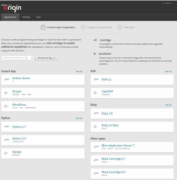 Aquí vamos a elegir el tipo de aplicación, que en mi caso usaré JBoss Application Server 7 Cartridge, y en la siguiente página nos pedirá introducir el nombre de la aplicación (por defecto me aparece jbossas) y el dominio que, como el servidor DNS está gestionado de forma dinámica, podría ser cualquiera. Más elementos que nos permite seleccionar/modificar es el tamaño del gear a usar y si queremos activar el escalado de las peticiones (esto último lo trataré en otro post). De momento elijo el gear “small” y “No scaling”. Al pulsar el botón “Create application” comienza el trabajo de fondo, la creación del usuario (gear), la jaula ssh, la actualización del DNS, cargar el cartucho en el gear, etc… Tras mostrarnos que la aplicación ya se ha creado, es momento de acceder a la url que sigue el patrón http://applicationname–dynamicdomain.domain.tld (en mi caso es http://jbossas–david.dmartin.es)